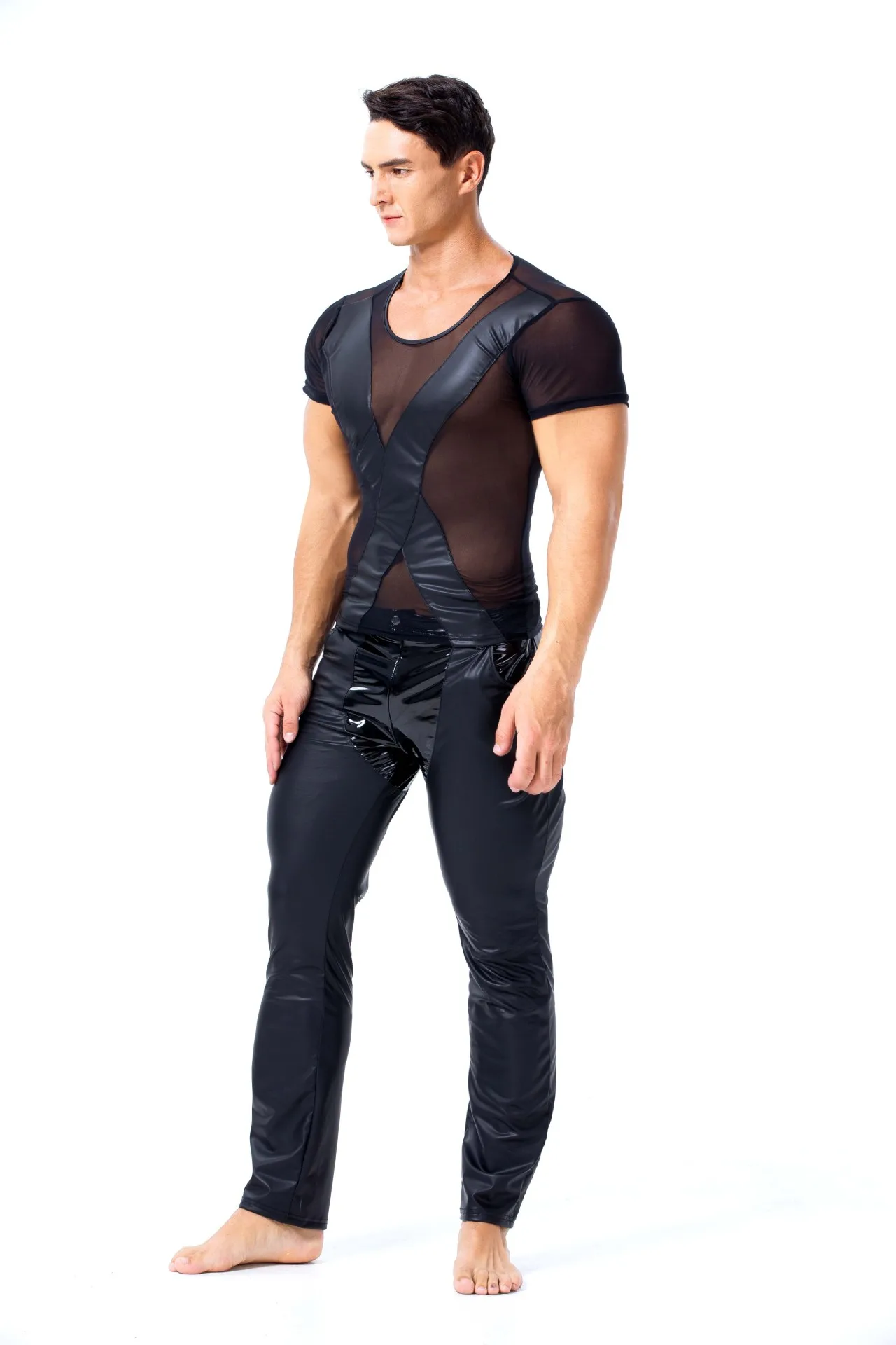 Сексуальная мужская футболка из сетчатой ткани, прозрачная лакированная кожа, Лоскутная футболка для мужчин, сценический танец, короткий рукав, круглый воротник, гей, облегающие Топы