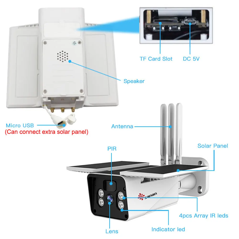 За камерой есть водонепроницаемый порт Micro USB, поэтому вы можете подключить свою собственную солнечную панель к этой камере, чтобы сделать мощность сильнее.