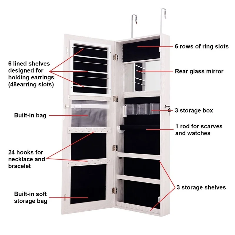 Технические характеристики Цвет: белый/Кофе/черный Материал: МДФ и зеркала Габаритные размеры: 16 "x 5" x 47,5 "(Д х Ш х В) Вес товара: 26,5 кг пакет включает в себя: 1 x ювелирный ключ для шкафа имеет 2 в 1 крепежный шкафчик с зеркалом для украшений: этот ювелирный шкаф предназначен для экономии пространства. С двумя крючками, которые легко висят на двери, и это никогда не повредит вашу дверь. Кроме того, длина крючка регулируется, она имеет 3 настройки для удовлетворения ваших потребностей. Если вам неудобно вешать его на дверь, подумайте об альтернативной установке. Его также можно установить на стену с помощью винтов. Ни один из способов не займет ваше место на полу. Идеальное гнездо для ваших ювелирных изделий: этот шкаф для ювелирных изделий аккуратно организует все ваши украшения с просторным пространством и умным дизайном. Он включает в себя 6 выложенных полок, предназначенные для хранения серег (48 отделений для сережек), встроенный мешок на молнии и мягкий мешок для кистей, 24 крючка для ожерелья и браслета, 6 рядов кольцевых слотов, 3 ящика для хранения, 1 стержень для шарфов и часов, 3 полки для хранения и зеркало. Кроме того, этот шкаф оснащен запираемыми ключами, которые обеспечивают безопасность вашей собственности. Превосходное Зеркало полной длины: этот шкаф имеет Зеркало полной длины, которое предлагает или обеспечивает лучшую производительность вашего головы до носка. Как только они попадают в безрамный зеркальный ювелирный Органайзер, многие люди больше не могут принять ювелирный шкаф с рамкой. Разница очень глубокая! Размер зеркала 40x12 см (16 "x 5"), который позволяет вам увидеть больше и наслаждаться другим. Прочная рама и защитный вкладыш: Изготовлен из доски высокой плотности и ПВХ-покрытия, что обеспечивает прочность и прочность. И удобная бархатная подкладка в ювелирном шкафу защищает ваши ювелирные изделия от царапин. Этот шкаф для ювелирных изделий может обеспечить вам долгий срок службы. Кроме того, используется высококачественная намагниченная дверная застежка и Улучшенная петля, которые обеспечивают безопасность нас. Стильный и удобный шкаф для ювелирных изделий: этот шкаф не должен быть в сборе, вы просто повесите его над дверью с помощью крючков или настенных кронштейнов и винтов перед использованием. Кроме того, этот шкаф легко чистить и поддерживать. С правильным размером и стильным внешним видом, идеальный подарок для вашей семьи и друзей. Описание это украшение, которое может получить все ваши ювелирные изделия и аксессуары, организованные и аккуратные. Он специально разработан для всех ваших ценностей, и он может держать ваши ювелирные изделия организованными и предотвратить их запутывание. Таким образом, как только вы откроете шкаф, ваши ювелирные изделия будут прозрачными с первого взгляда. Дней, чтобы провести 3 часа ищу ваши любимые сережки ушли навсегда. Шкаф поставляется полностью с местом для 6 выложенных полок для хранения сережек (включая 48 сережек), плюс 24 крючка для ожерелья и браслета и дополнительные встроенные сумки для хранения. Более того, этот шкаф включает в себя 6 рядов кольцевых слотов и 1 стержень для шарфов и часов. Кроме того, вы можете прикрутить его на стене или прикрепить крючки к двери. Просто сделайте это так, как вам нравится. И этот шкаф оснащен запираемыми ключами, что обеспечива