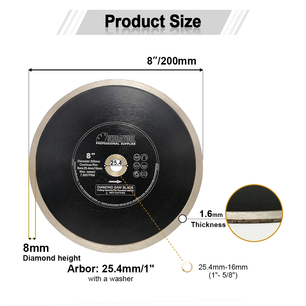 Спецификация:Диаметр 8 "/200 мм, диаметр 25,4 мм с 16 мм редуктором, высота алмаза 8 мм, Толщина сегмента 1,6 мм