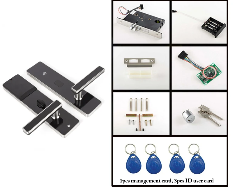 Each lock is packed with 1pcs Mater card and 3pcs blue keyfob user cards.