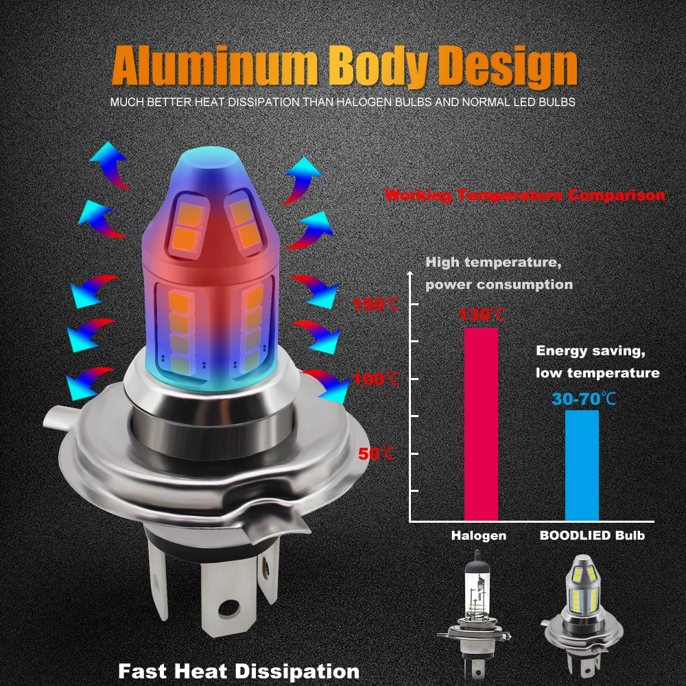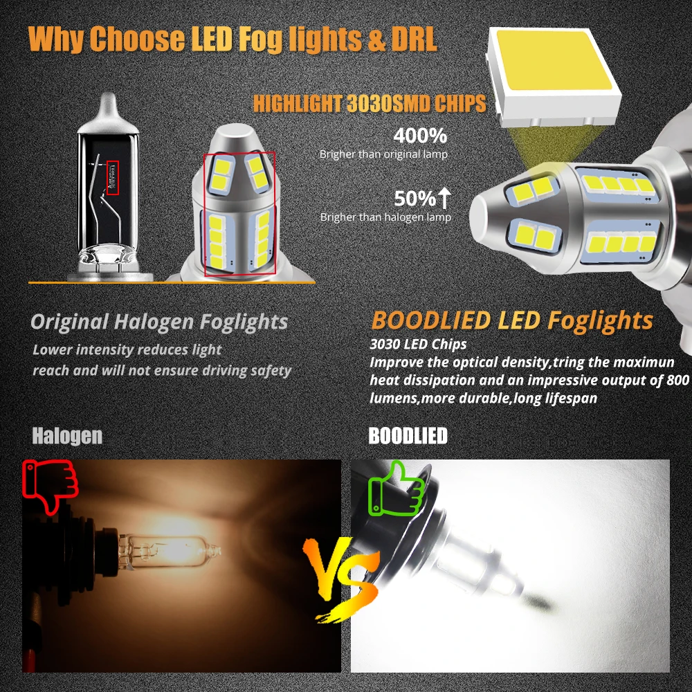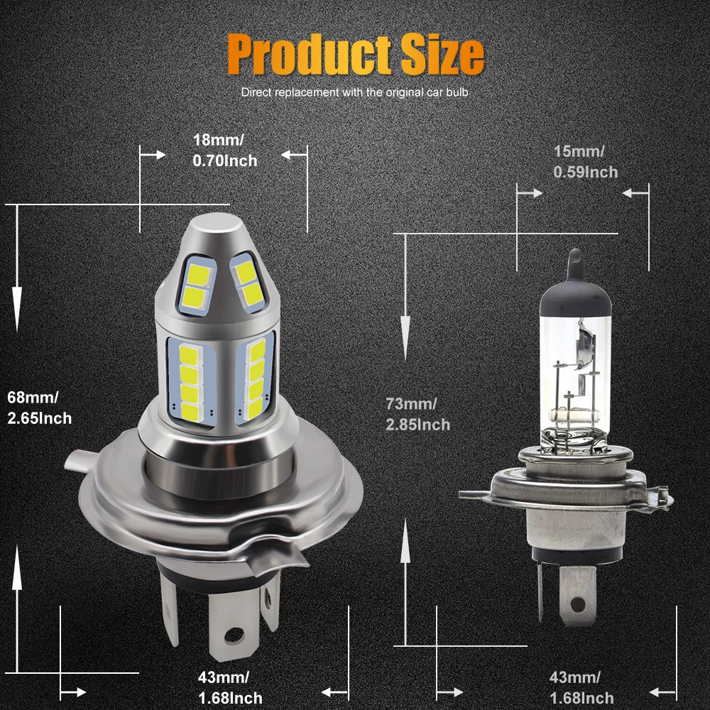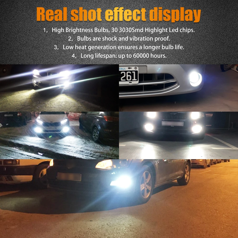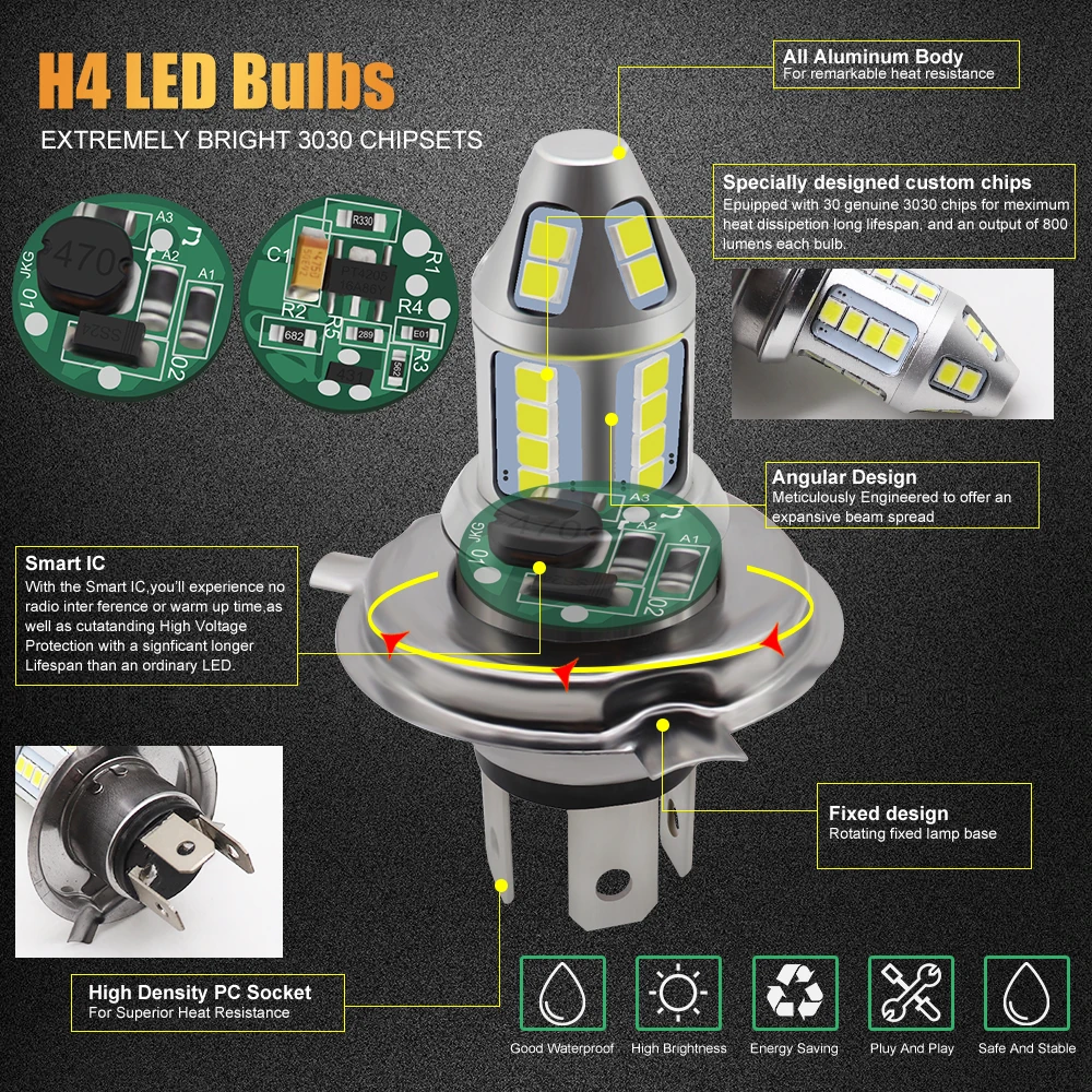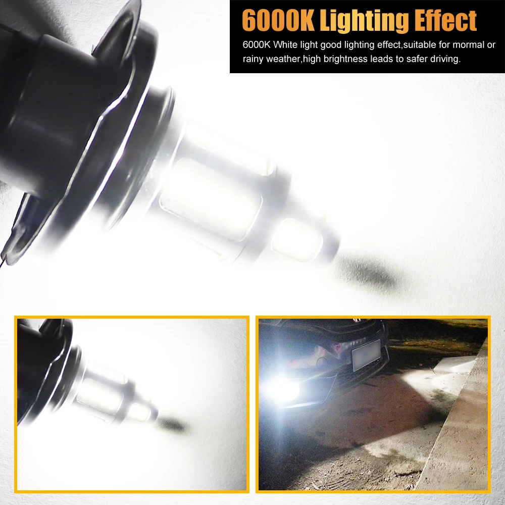 2pcs H4 LED Car Fog Lamp 150W with Decoder High Power 3030 30 Chip Waterproof White Auto Front Headlamp Fog Driving Lights 12V Features: 1. High brightness bulbs, 2pcs 3030 SMD high light LED chips.2. Bulbs are shock and vibration proof. Full Aluminum Body and Fast Cooling. More stable performance, Operating Temperature -40℃ - + 85℃. Low heat genaration ensures a longer bulb life. Long lifespan: up to 60000 hours.3. Improve the optical density, trying the maximun heat dissipation and an impressive output of 800 lumens, more durable, long lifespan.4. With the smart IC, you'll experience no radio inter ference or warm up time, as well as outstanding high voltage protection with a significant longer lifespan than an ordinary LED.5. Easy installation: All in one model, same as car original bulb, Plug and Play Important: The product does not have CANBUS error free. This product is equipped with a decoder for you. If there is an error or flashing after installing the lamp, please connect the lamp to the decoder!If you have any other questions, please feel free to contact me!Note: Because this lamp product is made of aluminum, the temperature of the lamp will be higher than that of the halogen lamp when using it. Please rest assured that the lamp transmits heat to the outside when it dissipates heat. LED Bulb Advantage: Fast ON/OFF, NO "warm up".Energy Saving 70% when compared to the regular halogen bulbs & has a life span 10 times longer than them.Safe for driving. Specification: Bulb Type: Hi-Lo beamColor Temperature: 6500K pure whiteWorking Voltage: AC 9-30V, DC 12V-24VPower: 5.0Watts(Hi-Beam)/bulb, 3.5Watts(Lo-Beam)/bulbChips: 3030 Chips (30pcs)Working efficiency: 99.8%Material: AluminumOperating Temperature: -40°C ~ +85°CWorking Life: over than 60000 hoursUsage: fog light, DRLCertification: CE, RoHSIP67 rated water and dust seal, 360 degree beam angle Package include:2pcs H4 LED Car Fog Lamp