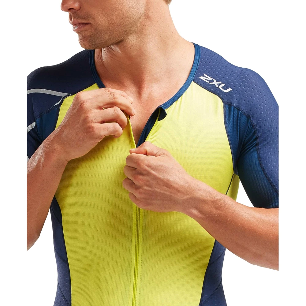 Для получения стабильных результатов в триатлоне, поддержания сил на необходимом уровне, снижения усталости предназначен мужской стартовый костюм с молнией 2XU Perform из прочной эластичной ткани. Эффективно проявляет свои лучшие свойства в ходе соревнований. Эргономичная форма не имеет швов, вызывающих потертости кожи. Модель предусматривает наличие трех задних карманов.