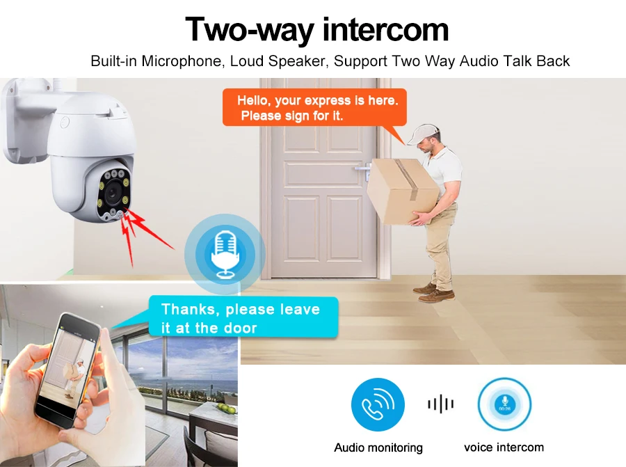 Can realize remote monitoring/two-way voice intercom/can set early warning alarm bell/can customize the voice warning content,monitoring distance of 10M, intercom distance 30M.