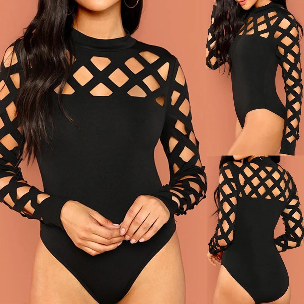 Женский летний боди с длинным рукавом, сексуальный полый однотонный боди, облегающая одежда, комбинезон размера плюс, боди с рукавами 03 *