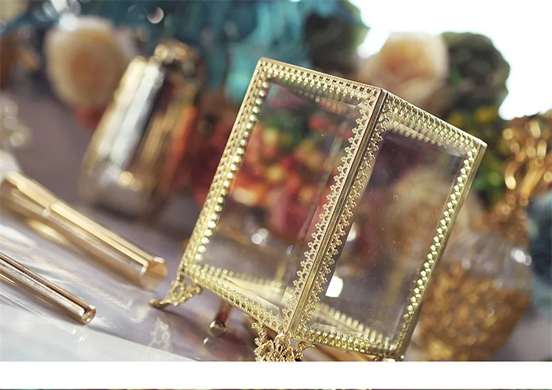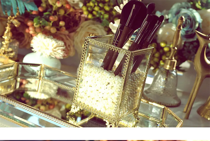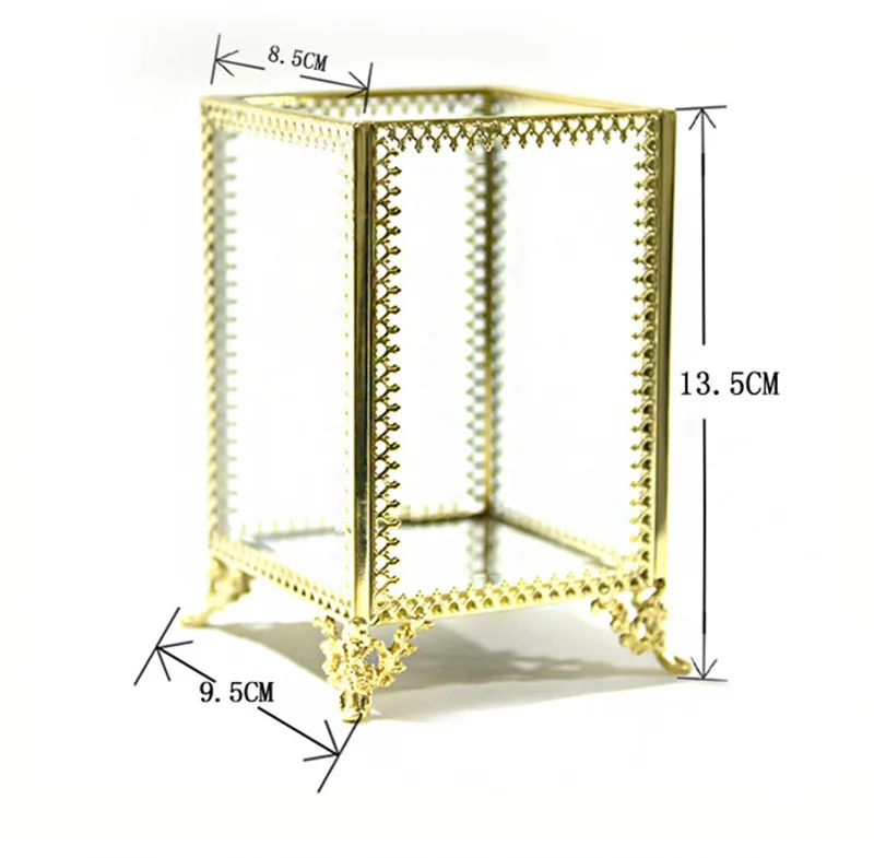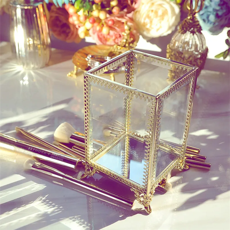 [Товар]: коробка для хранения, отделочная коробка, прозрачная стеклянная Кисть для макияжа, баррель для хранения, европейская ретро медная окантовка, кисть для красоты, карандаш для бровей [Материал]: акрил [Цвет приспособления]; Золотой [Посылка]: 1 * пустая коробка