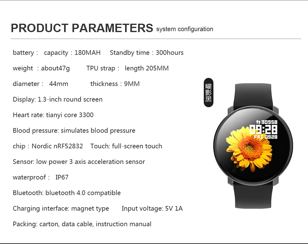 Описание: 1,3 дюймов полный сенсорный Экран смарт-часов --- подача заявки на IP67 класс водонепроницаемости, он полностью водонепроницаем при мытье рук или попали под дождь. Время автономной работы 5 дней, это идеальный компаньон, который держит вас организованными и производительными в течение всего дня. Наручные часы «Все в одном»-шагомер, счетчик калорий, трекер здоровья, напоминание о сидячем положении, удаленные фотографии, управление музыкой, напоминание о звонках, будильник, прогноз погоды, уведомление по электронной почте, SMS facebook, Twitter, Skype, WhatsApp и т. Д. Персональный трекер здоровья-Встроенные оптические датчики сердечного ритма, Точно Отслеживайте частоту сердечных сокращений в реальном времени, умный мониторинг сна, помогая вам настроить себя для более здорового образа жизни. Отслеживание активности на весь день-фитнес-трекер для бега с Bluetooth, точно записывайте активность на весь день, например шаги, расстояние, сжигаемые калории, активные минуты. Специальные спортивные режимы для прогулок, бега, езды на велосипеде, прыжков, бадминтона, баскетбола, футбола, плавания. Супер Совместимость --- этот smartwatch, поддерживает большинство смартфонов с iOS 9,0 или выше, Android 4,4 или более поздней версии. Скачайте и установите бесплатное приложение, совместимое со всеми смартфонами с поддержкой Bluetooth, включая iPhone, Samsung, LG, Huawei и т. д.