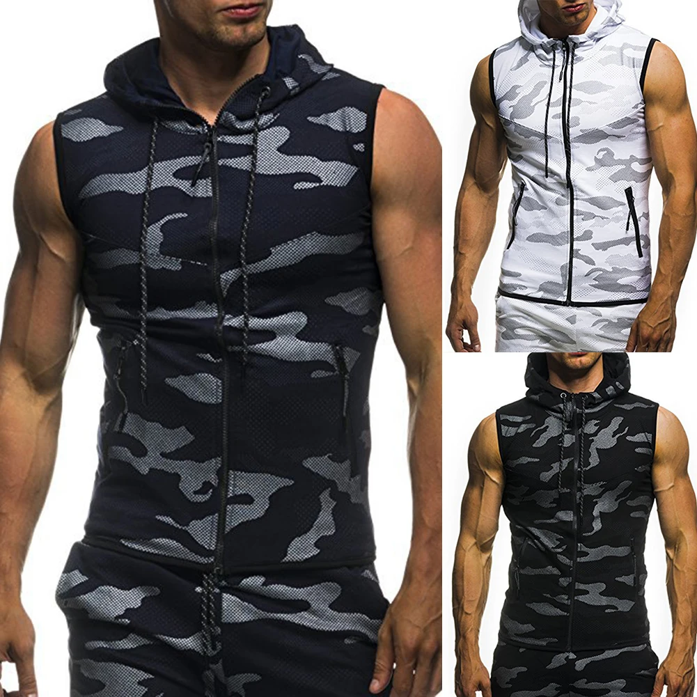 Мужские спортивные камуфляжные толстовки с сеткой, на молнии, без рукавов, для фитнеса, на лето