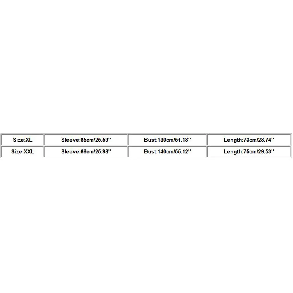 Size Sleeve Bust Length XL 65cm/25.59'' 130cm/51.18'' 73cm/28.74'' XXL 66cm/25.98'' 140cm/55.12'' 75cm/29.53''