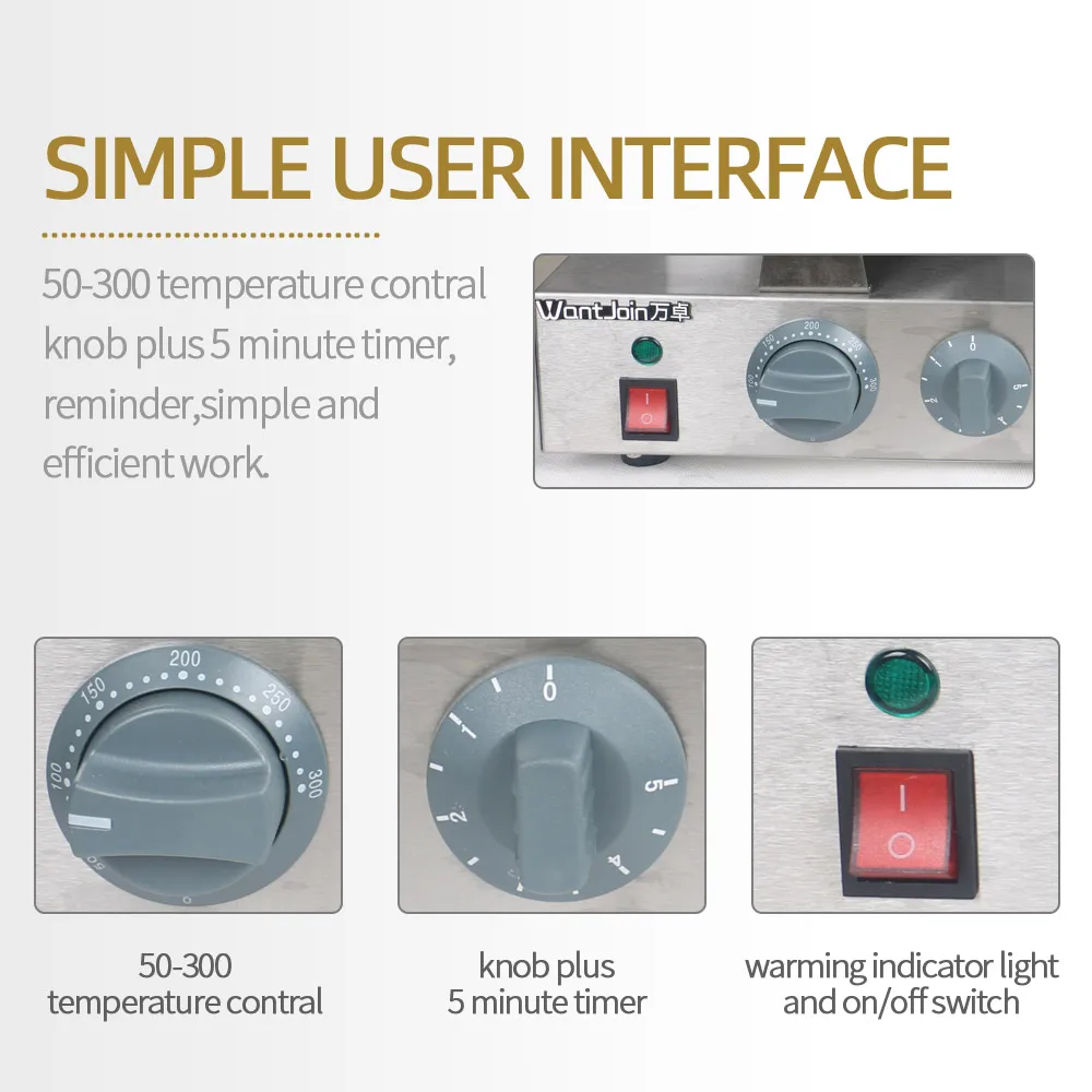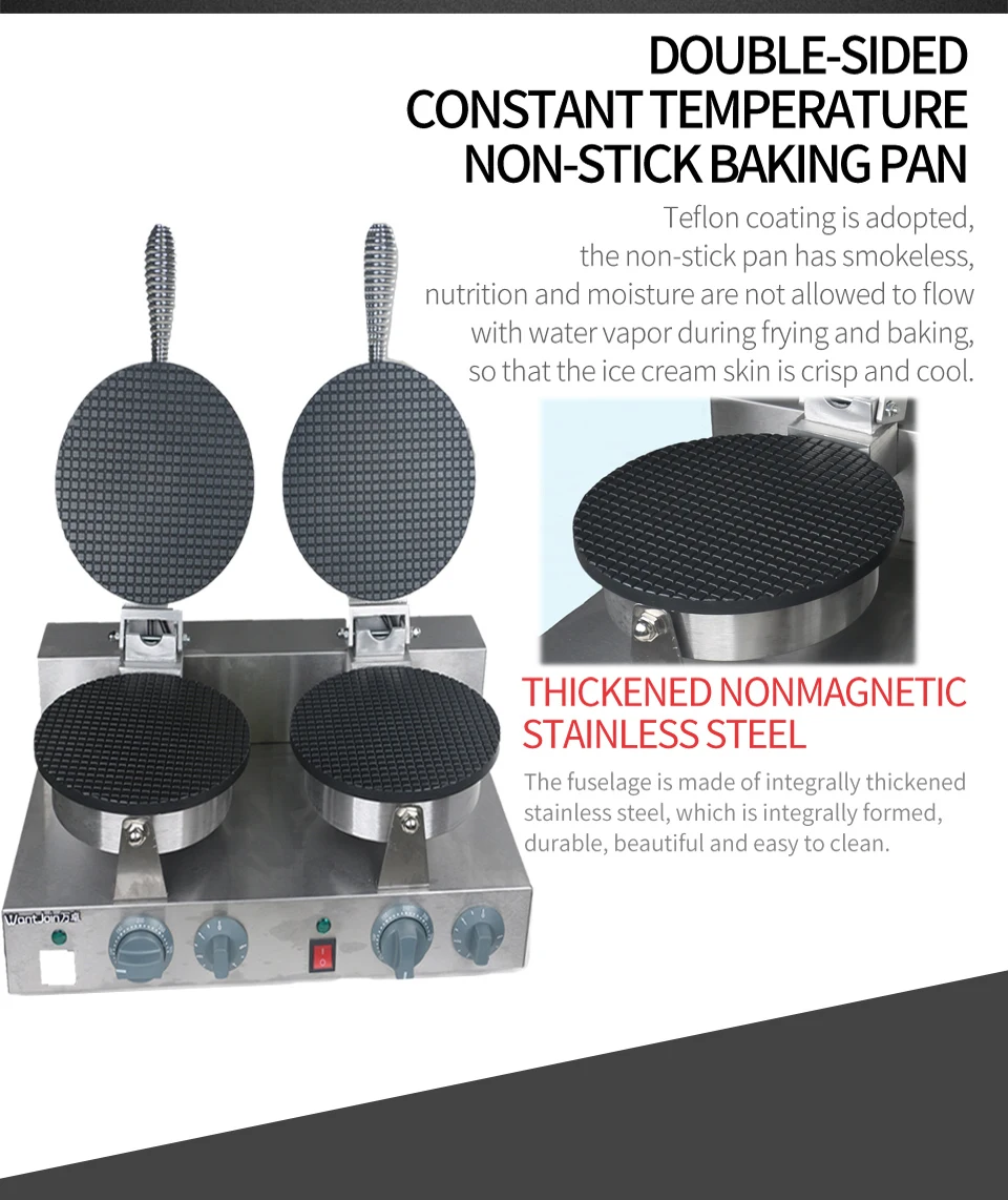 1. Регулируемый термостат, антипригарная варочная поверхность, корпус из нержавеющей стали, прочный и модный. 2. Встроенный шнур, интеллектуальный контроль температуры, простой пользовательский интерфейс, напоминание точного контроля времени выпечки. 3. Профессиональное тефлоновое покрытие, антипригарная форма, удобная чистка. 4. Холодный сенсорный внешний вид, двусторонний постоянный нагрев температуры, выпечка более равномерная.
