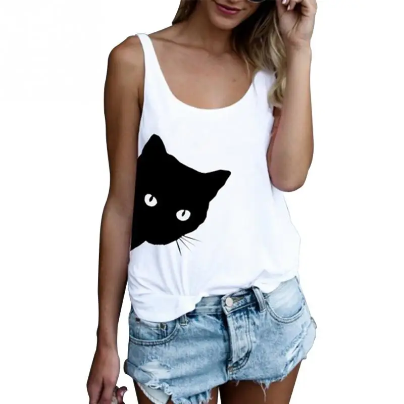 Летние женские на бретелях 2 топы Модные хлопковые носки с изображением кошечки Pinrt пикантные жилет женский Свободная майка без рукавов с О-образным вырезом на шее, Повседневное платье-майка Топ