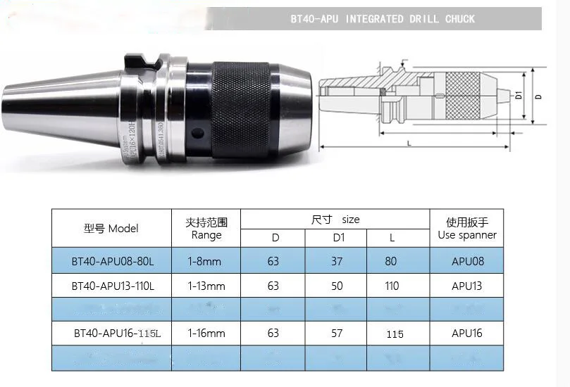 Название: полный сверлильный патрон Материал: 20CrMnTi Твердость: HRC 56 градусов Резьба для вытяжного отверстия: M16 Длина BT40-APU08 = 80 л; Диапазон битный зажим: 1-8 мм Длина BT40-APU13 = 110 л; Диапазон битный зажим: 1-13 мм Длина BT40-APU16 = 115л; Диапазон битный зажим: 1-16 мм В комплект входит: 1 шт. BT40 APU держатель инструмента 1 шт. APU гаечный ключ 1 шт BT40 вытяжной гвоздь