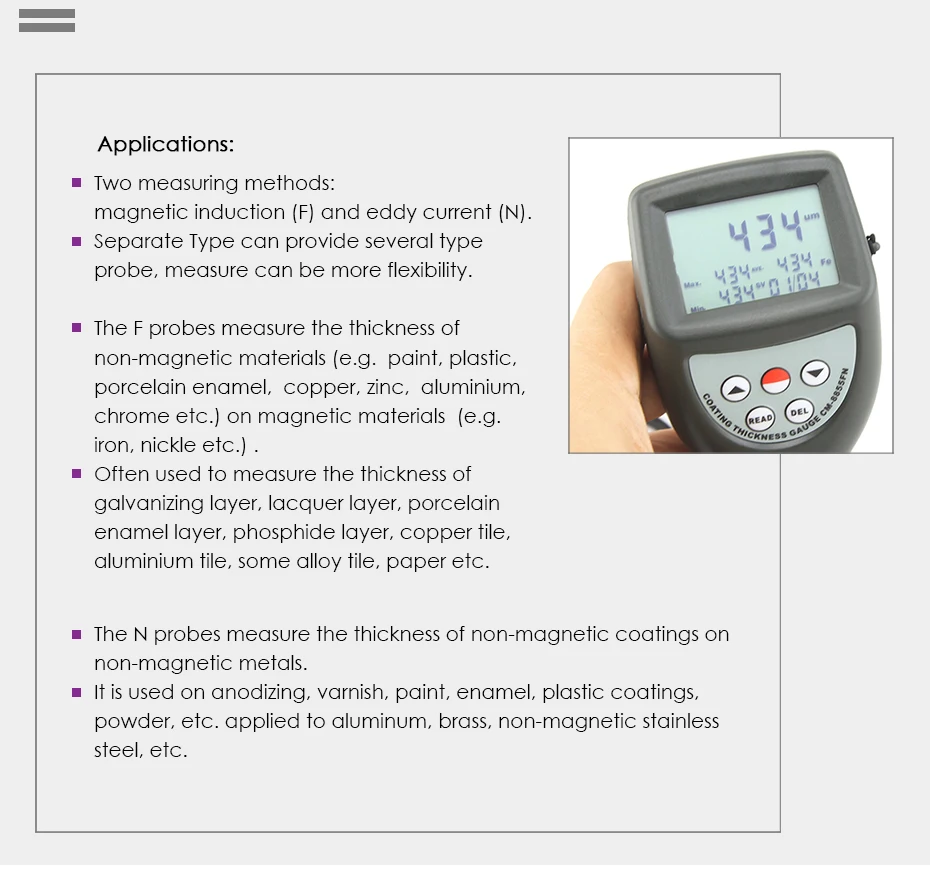 Область применения: Зонды F измеряют толщину немагнитных материалов (Е. g. Краска, пластик, фарфоровая эмаль, медь, цинк, алюминий, хром и т. д.) на магнитных материалах (Е. g. Железо, никель и т. д.). Часто используется для измерения толщины гальванического слоя, лакового слоя, фарфорового эмалированного слоя, фосфидного слоя, медной плитки, алюминиевой плитки, некоторые плитка из сплава, бумаги и т. Д. Зонды N измеряют толщину немагнитных покрытий на немагнитных металлах. Используется для анодирования, лака, краски, эмали, пластиковых покрытий, порошка и т. д. применяется для алюминия, латуни, немагнитной нержавеющей стали и т. д. Особенности: * Можно хранить новые данные в 99 групп. * Два метода измерения: магнитная индукция (F) и вихревой ток (N) * Два режима измерения: один и непрерывный (Примечание: непрерывный режим удобен для измерения толщины покрытия изогнутых объектов и крошечных объектов.) * Выбор метрической/императорской системы. * Ручное или автоматическое отключение. * Автоматическая память калибровочного значения и автоматическое распознавание подложки. * Процесс работы имеет жужжание напоминание, в то время как не жужжание в непрерывном режиме. * Используйте выход данных USB/RS-232 для подключения к ПК. * Предоставляем Bluetooth выход данных. * Интегральный тип подходит для работы одной рукой, большой зонд с большой контактной поверхностью имеет лучшую стабильность, пользователи могут получить непрерывные, хорошие повторяющиеся и точные измерения.