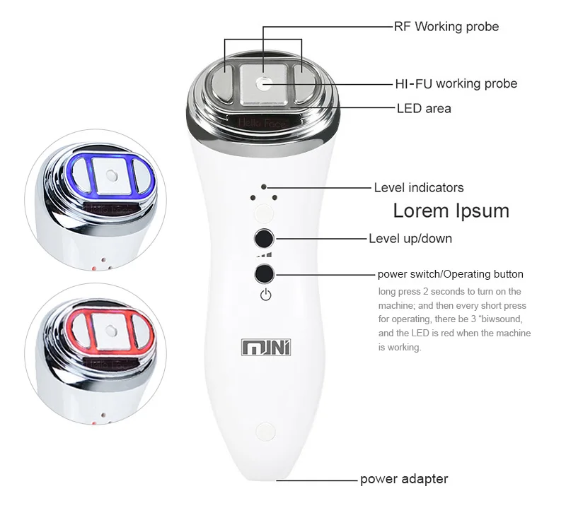 1. Удобно при обработке: энергия проходит через кожу, не повреждает. 2. Лифтинг лица, активирует коллаген, улучшает увлажнение кожи, подтягивает кожу, формирует V лицо: уменьшает поры и твердую кожу, формирует ваше V лицо. 3. Подъемная Шея: массирует и поднимает шею. 4. Улучшение состояния кожи глаз: вокруг глаз нежные, поэтому, пожалуйста, используйте низкий уровень для ухода за глазами вокруг. Он может удалять темные круги.