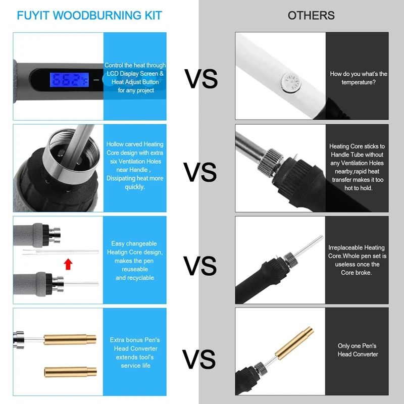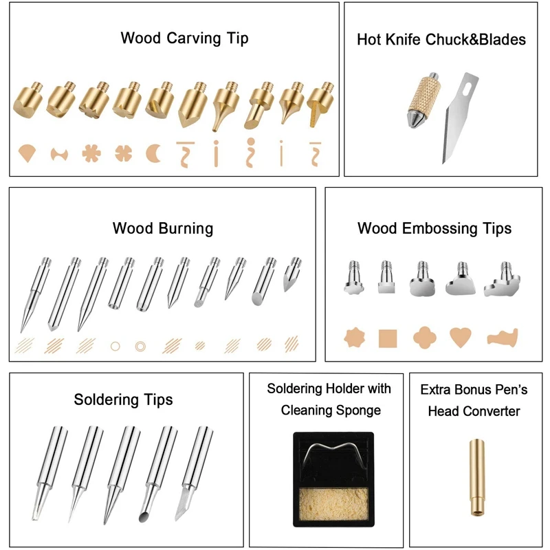 ЖК-экран, новейшие инструменты для пирографии (60 Вт) с термостатическим цифровым управлением светодиодный ЖК-экран дает вам визуальный контроль тепла для любого проекта. Идеально подходит для людей всех уровней мастерства. Сжигание, пайка и резка, с несколькими взаимозаменяемыми наконечниками (универсальный, поток, конический, каллиграфия, затенение, передача, горячий нож и припой), этот набор для древесной горелки может использоваться как комплект для выжигания, паяльник и резак горячего ножа. Работа для кожи, пробки, плата сварочной цепи, пены и т. Д.