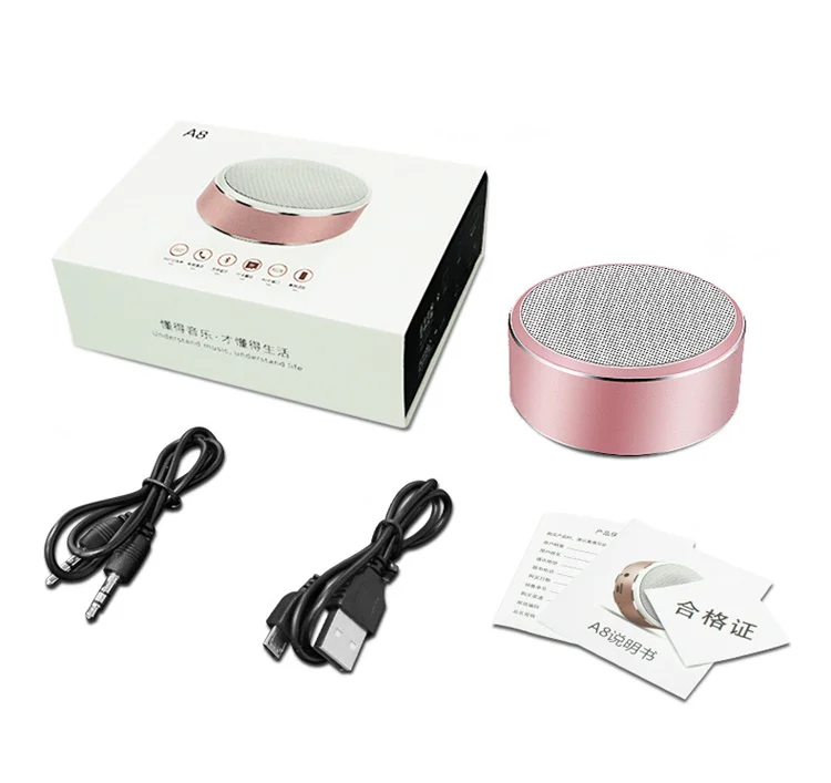 1. Модель: HBR-A8 2. Название: портативный bluetooth-динамик 3. Материал: металл 4. Емкость аккумулятора: 400 мАч 5. Мощность: 3 Вт 6. Расширение памяти: поддержка 7. Размер продукта: 85*37 мм 7. Вес нетто продукта: 0,18 кг 8. Посылка Размер: 10,8*10,8*8,8 см