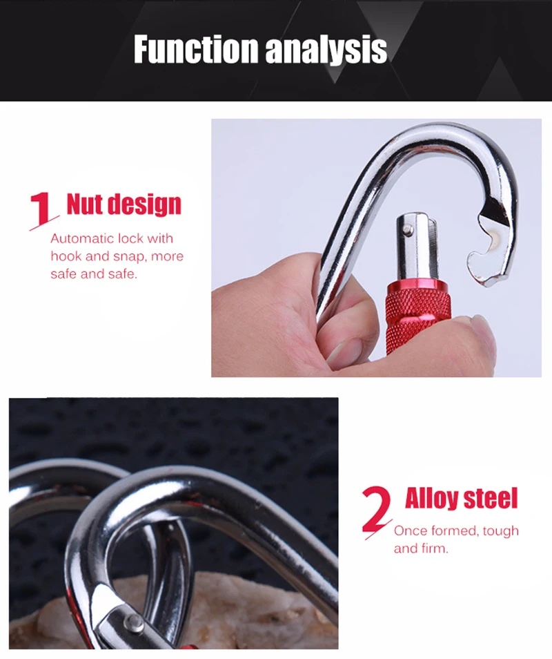 Название продукта: Многофункциональный замок Вес изделия: 165 г Материал изделия: легированная сталь Размер изделия: длина 11 * ширина 6 * диаметр 1 см Функция: Йога гамак замок/скалолазание/высокая высота работы/открытый