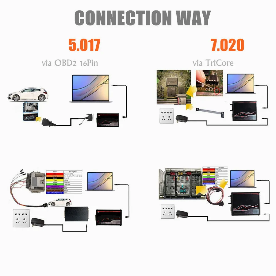 Пожалуйста, не обновляйте онлайн, это повредит устройство и не может использовать больше.При запуске программного обеспечения закройте антивирусную программу.Какие различия между 5,017 и 7,020?Если вы в основном хотите работать на 24V грузовиках и тракторах, V7.020 больше подходит для вас!1. Различные способы подключения:Для V5.017, он может читать и писать ECU через OBD2 кабель непосредственно для большинства транспортных средств, прост в эксплуатации.Для V7.020, он считывает и записывает ECU через TRICORE или BDM или другой режим со специальным кабелем, программное обеспечение будет направлять вас, как работать.2. Различное покрытие транспортного средства:Например: 5,017 и v7.020 все могут работать для большинства для Toyota Denso ECU протокол, но только 7,020 может работать для Toyota Hilux kun26 очень хорошо!V7.020 может поддерживать гораздо больше грузовиков/тракторов/мотоциклов, чем V5.017!Для некоторых автомобилей. V5.017 просто можете прочитать его. Но V7.020 может читать и писать его.![]()