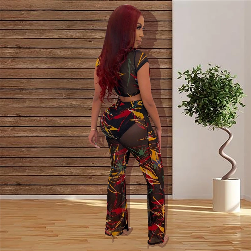 Adogirl Fashion Print Sheer Mesh Two Piece Set Short Sleeve Crop Top Wide Leg Pants with Panties Women Sexy Night Club Suits