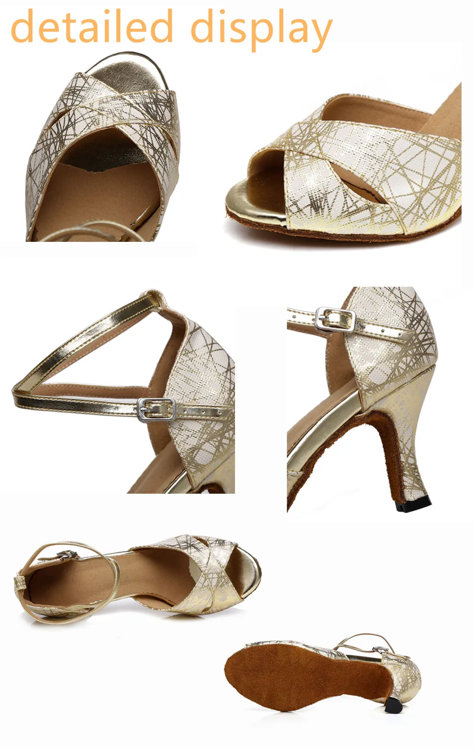 Блестящие туфли для латинских танцев; 1. Цвет: Золотой в наличии, любой другой цвет может быть настроен; 2. Размер: 4-11 долларов США, дополнительный маленький размер и размера плюс могут быть настроены; 3. Высота каблука: 6 см, 7,5 см, 8,5 см, 9 см, высота каблука 10 см, могут быть выполнены по индивидуальному заказу; 4. Материал верха: искусственная кожа; 5. Материал подошвы: мягкая подошва из кожи и замши; 6. Повод: вечерние/бальные/танцевальные и т. Д.; 7. Подходящий танец: Сальса Румба Танго Джаз кизомба Самба Чача Бачата и т. Д. Виды бальных танцев.