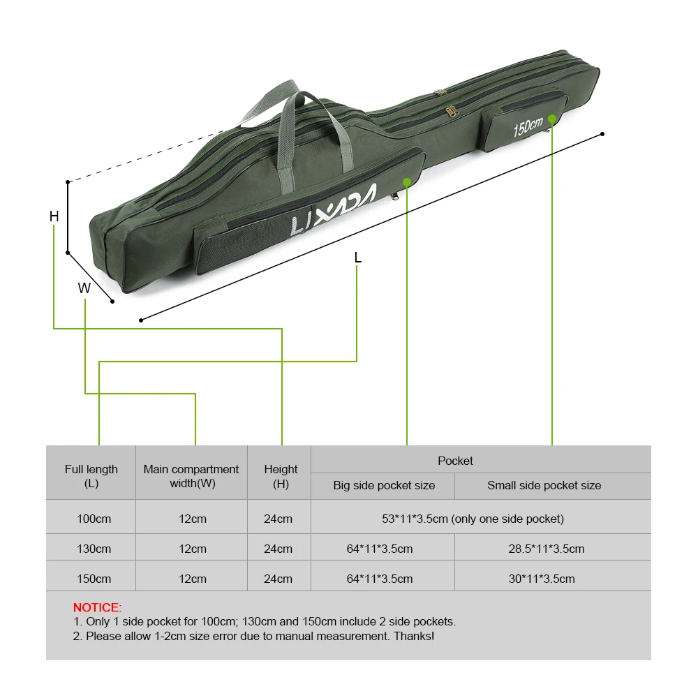 Notice: 100cm fishing bag only has 1 exterior pocket, 130cm and 150cm have 2 exterior pockets.