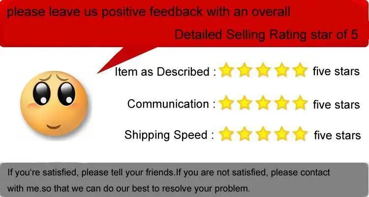 1. Если вы удовлетворены покупкой и нашим общим обслуживанием, ваш комментарий очень важен для нашего бизнеса. Пожалуйста, уделите минуту, чтобы оставить нам положительные отзывы с общей детальной продажной звездой 5. 2. Если у вас есть проблемы с нашими товарами или услугами, пожалуйста, не стесняйтесь связаться с нами, прежде чем вы оставите благородные отзывы. Мы решим любую проблему и предоставим вам лучшие услуги кустомера.