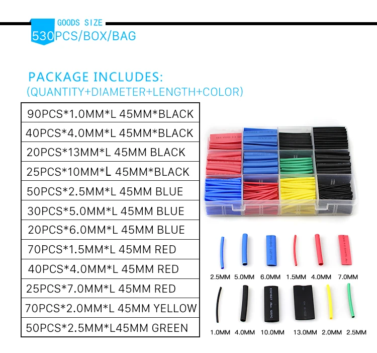 Ассорти в коробке, который содержит 11 размеров соотношение 2:1 термоусадочная трубка. Легко сказать и использовать. Есть 5 цветов, которые помогают различать различные размеры: желтый, синий, черный, зеленый, красный. Есть 11 спецификаций, которые отвечают различным потребностям: проводное соединение, защита от припоя, концы проводов и так далее. Отличная защита окружающей среды, изоляция, мягкая, стабильная производительность, низкая термоусадочная температура, термоусадочная и т. д. Водонепроницаемое уплотнение, экологически чистое.