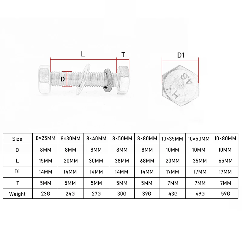 -Размеры: M8 x 25, M8 x 30, M8 x 40, M8 x 50, M8 x 80, M10 x 35, M10 x 50, M10 x 80