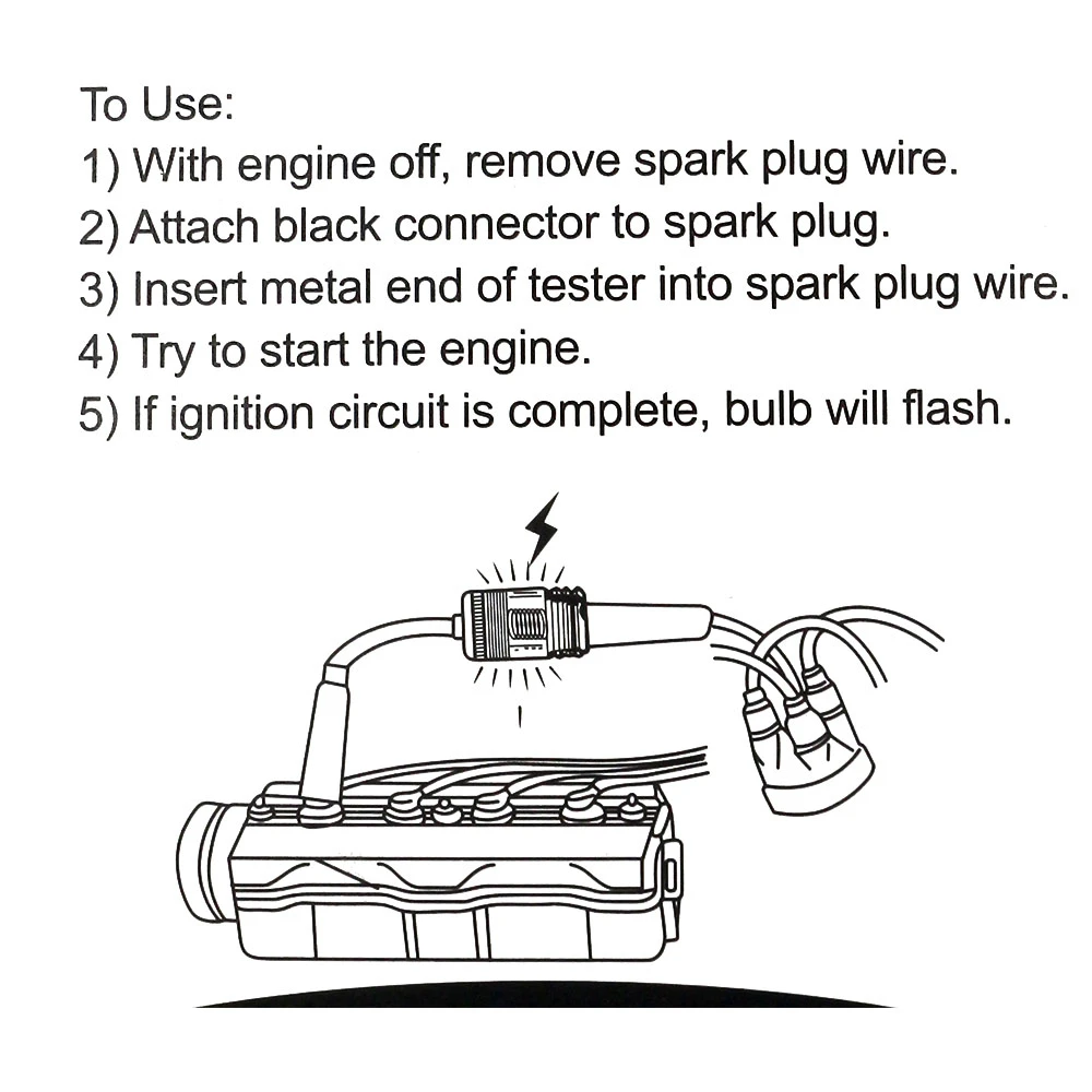 1. Подключите тестер между свечей зажигания и кабелем вилки просто, винт в сборе быстро и легко регулирует свечу зажигания. Зажимы надежно крепятся к земле, чтобы предотвратить попадание искры высокой энергии на любой пол.