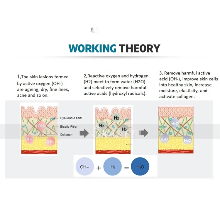 Водородная вода богата O2, что может помочь с улучшением кожи фацидные акне кожи и жирной кожи. Он может проникать в клетки человека и эффективно удалять фактор возбуждения (свободные радикалы), устраняет реактивный окси, оригинальные вредные ингредиенты через воду, удалите вредоносную кислоту внутри кожи и тем временем Пополняйте воду под слоем дермы.