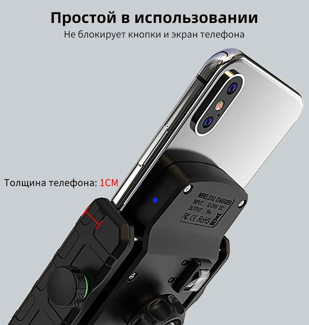 DC 3.6~6.5В 3А (поддерживает 5В/3А) DC 6.5~9В 2А DC 9~12В 1,5А • Беспроводной выход для зарядки: до 15Вт (для iphone 7.5Вт) (только ZM8W) • Длина зарядного провода: 1,5м / 59 дюймов • Диапазон изменения ширины: 60мм~90мм / 2.36 дюйма ~ 3.54 дюйма • Для телефонов толщиной (максимально): <=10мм / 0,39 дюймов • Для телефонов диагональю: 3.5~6.5 дюймов • Диаметр руля: 15~30мм • Материал: нейлоновое стекловолокно (PA66+30%GF) Конструкционная пластмасса