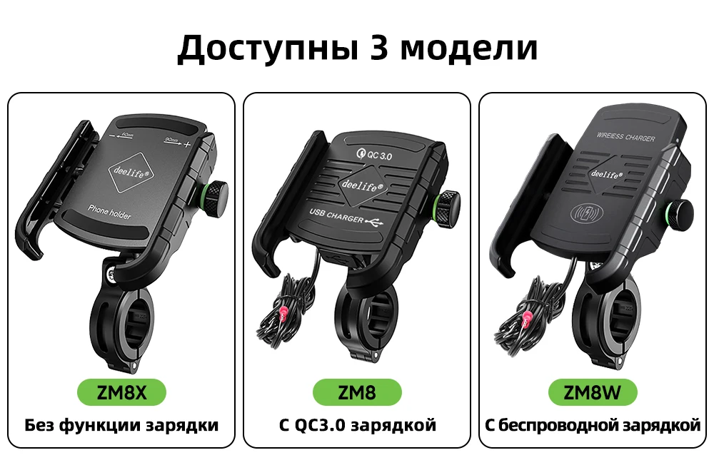 • Экологически чистый силикон, противоударный и нескользящий • Механическая фиксация, Стабилизация • Встроенный предохранитель для безопасного использования • 5 защитных функций, ① Защита от перенапряжения, ② Защита от перегрузки, ③ Защита от короткого замыкания, ④ Защита от перегрева, ⑤ Защита от водыОписание продукта • Тип продукта: Многофункциональный держатель телефона для мотоцикла • Входное напряжение: 12В-24В (9В минимум и 28В максимум) • Выходное напряжение USB: Поддержка быстрой зарядки QC 3.0 (только ZM8)