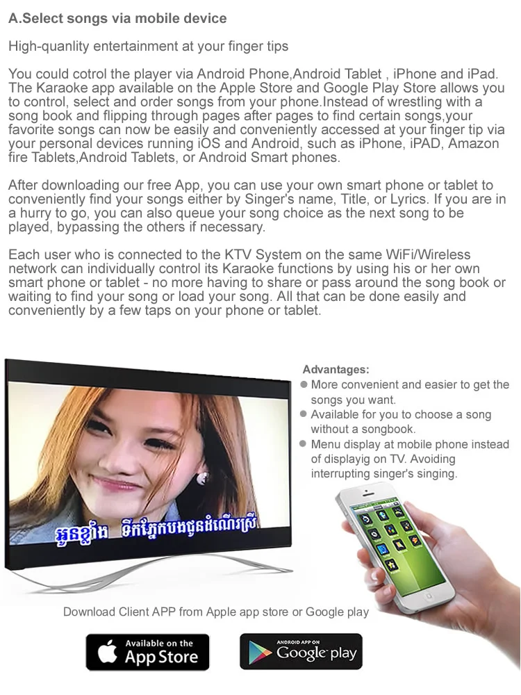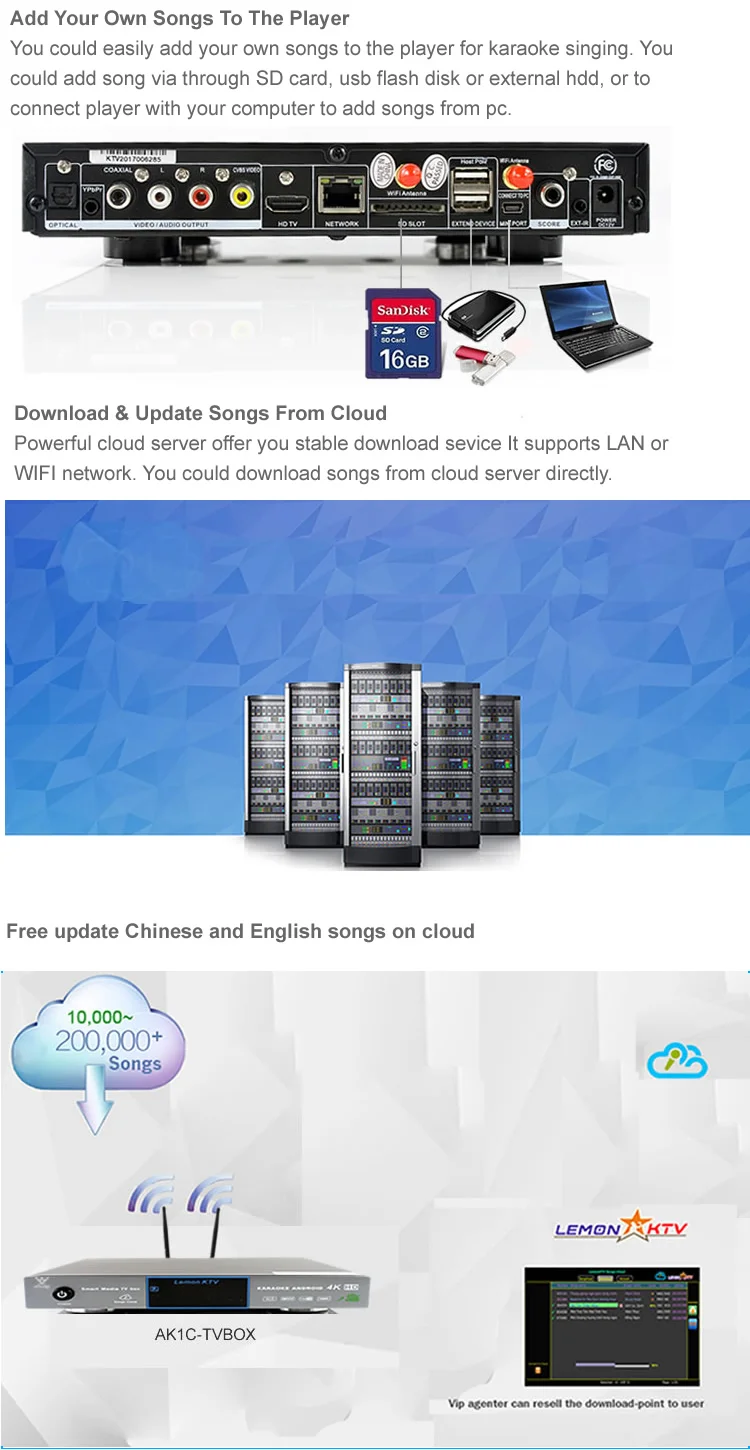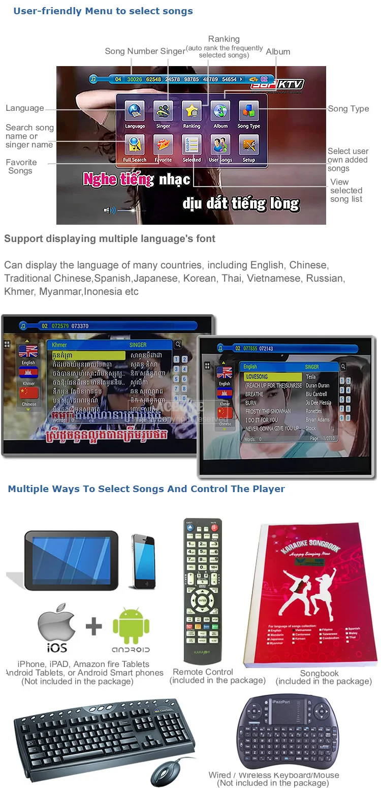 : 54280 мандарин DVD песни, 14491 Cnatonese DVD песни, 8674 тайваньские DVD песни, 37052 английские CDG песни, 14506 английские VCD песни, 12152 + 4500 английские DVD песни, предварительно загруженные в 6 ТБ HDD для прямого караоке пения