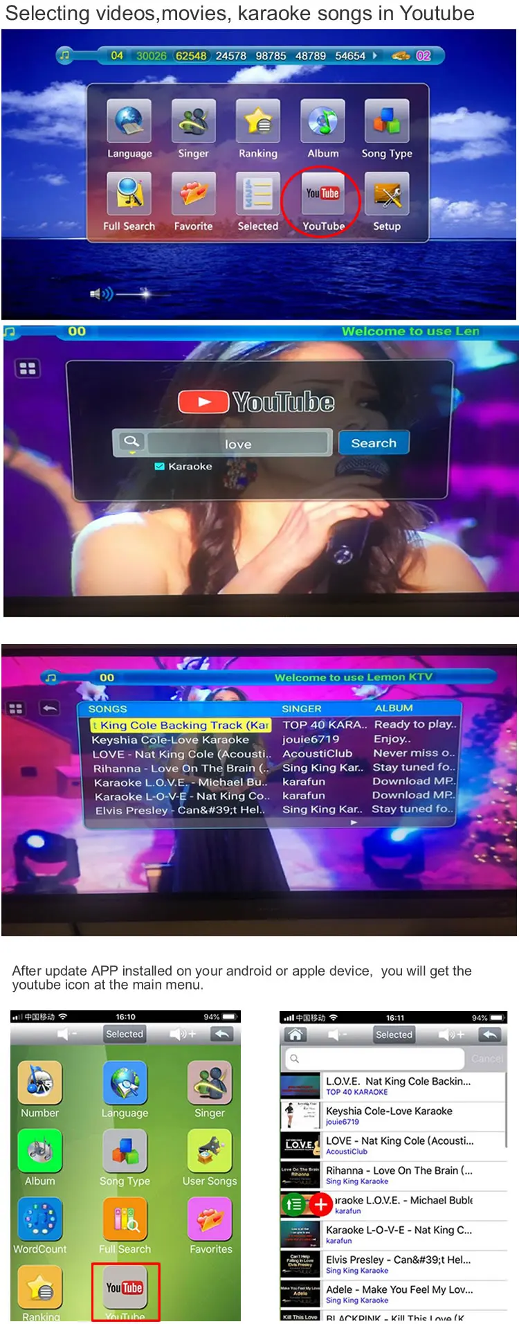 Если некоторые песни, которые вы не смогли найти на HDD или на плеере cloud, вы могли бы попробовать найти их с YouTube, песни YouTube могут быть добавлены в плейлист для караоке пения