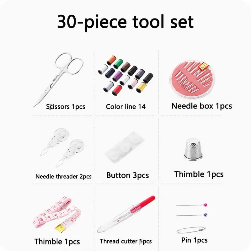 30 шт./набор, портативная дорожная швейная коробка, Kitting инструменты для игл, стеганая нить, вышивка, ремесло, швейные наборы, Домашний Органайзер Особенности: -Полностью оборудованный комплект для шитья, удобный для переноски и использования. -Легкий и приятный дизайн. -В одной сумке, включая все, что вам нужно для основного швейного инструмента. -Можно использовать как дома, так и в путешествиях. -Отлично подходит для шитья украшений, ремесел, одежды, изготовления платьев и т. д. -Набор для шитья-прекрасный подарок для частых путешественников, артистов, мам, бабушек, туристов, студентов, детей, маленьких девочек! Характеристики: -Материал: полиэстер, пластик, металл -Размеры: 12,5x12x2,5 см/4,92 ''x 4,72'' x 0,98'' -Цвет: черный Посылка включает в себя: 1 x Ножницы из нержавеющей стали 1 х длинная измерительная лента 14 x цветные катушки резьбы 3 пуговицы рубашки 2 x считыватель игл 2x защитные булавки 1 x шовный Потрошитель 1 х металлическая наперсток 2 жемчужных штифта