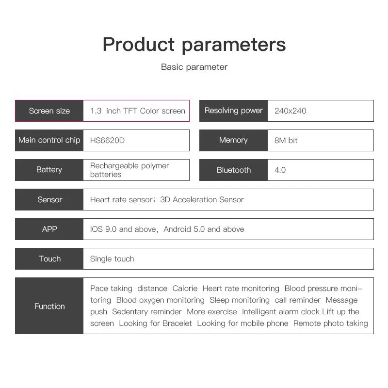 * Совместимая версия телефона: IOS8.0 и Android 4,4 выше * Зарядный порт: usb-порт для зарядки * Емкость аккумулятора: 100 мА · ч * Время в режиме ожидания: 7 дней или около того * Время работы: 3-5 дней * Материал: ТП пластик * Расстояние: Поддержка * Процессор: LD719-V1.0 * Кнопка: одно касание * Версия BT: 4,0 • Функции: Кровяное давление/пульс/Кислород крови/калории/вибрация “mator/сидячий/Будильник/часы/мониторинг сна/найти телефон/Найти Часы/Движение жестов * Уведомления о сообщениях: QQ, facebook, whatsapp, twitter, Skype, instagram, wechat * Экран: цветной 1,3 "экран * Дисплей: разрешение 240*240 * Тип Oled: стоп * Язык приложения: китайский, английский, испанский, французский, голландский, португальский, немецкий, русский, турецкий, японский, персидский, арабский, Малайзия, тайский.