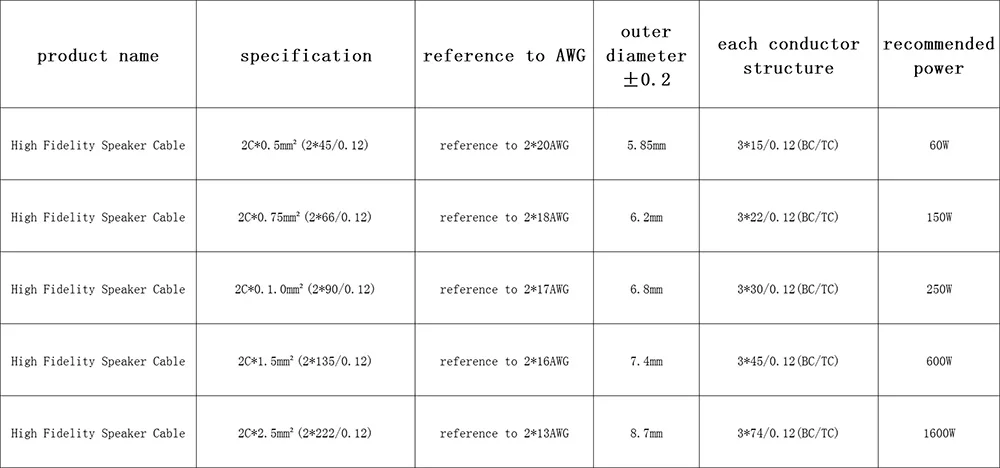 Вышеуказанная Рекомендуемая мощность-Номинальная мощность 8 Ом типа сопротивления динамика. Для лучшего качества звука, когда расстояние превышает 20 метров или пиковая мощность динамика в 2 раза выше номинальной мощности, рекомендуется выбрать более плотную линию, ту же линию, при использовании в диапазоне от 70 до 110 В постоянного напряжения, Поддерживаемая мощность больше, а расстояние передачи-больше. Вышеуказанные данные только для справки, пожалуйста, проконсультируйтесь с нами для получения подробной информации. Применение: 2C * 0,5/2C * 0,75: для небольших мультимедийные колонки, маленькие радиовещательные колонки 2C * 1,0/1,5: для обычного домашнего аудио, 5,1/7,1 домашнего кинотеатра аудио, маленький KTV аудио, небольшой квадратный аудио, вещательные колонки и так далее. 2c * 2,5: широко используется в больших КТВ, барах, квадратах, концертах, кинотеатрах, оперы и т. Д.