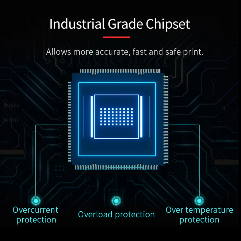 Промышленный чипсет, который обеспечивает более точную и быструю печать. Защита с такими функциями безопасности, как защита от перегрузки по току, защита от перегрузки, защита от перегрева, предтемпературная сигнализация. (выключите нагревательный выключатель автоматически)