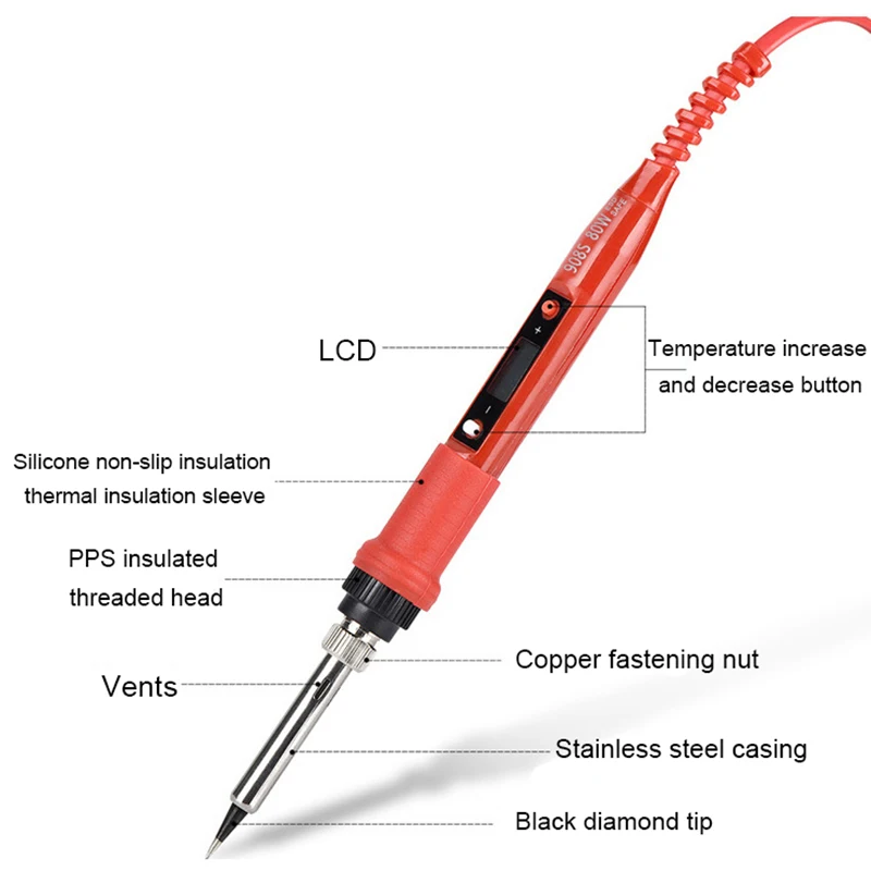 ** Высокое качество: Модернизированный термостойкий материал, металлическая и пластиковая ручка с силиконовой крышкой, и стальная вентиляция труб отверстия на наконечнике припоя помогает охладить быстро.