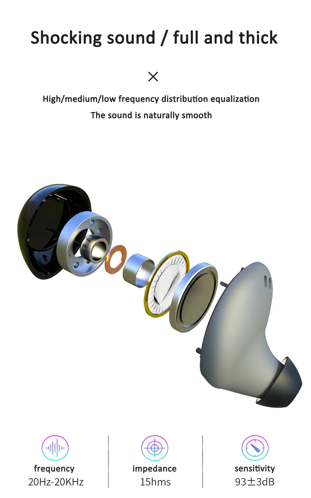 Чип Bluetooth: 5,0 Акустическая Диафрагма: графеновая углеродная нанотрубчатая диафрагма Звуковой блок: 6 мм пользовательский HIFI микро полный частотный блок Акустическая структура: Закрытая полость Частотный диапазон отклика: 20 Гц-20 кГц Чувствительность: 93 ± 3 дБ Выходная мощность: обычная 2 МВт, макс.: 5 мВт Один наушник Вес: 4,5 г Вес зарядного устройства: 100,5 г Общий вес продукта: 205 г Размер наушников: 24*18,5*26,5 мм Зарядный контейнер размер: 65,3*34,6*24,5 мм