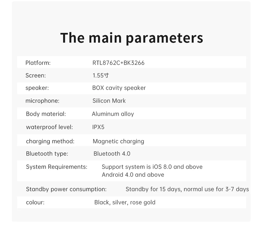 Основные Функция: * Bluetooth-звонки, SMS,Facebook,Twitter уведомления и т. Д. * Монитор сердечного ритма, измерение артериального давления и измерение кислорода в крови • Шагомер • Измерение показателей ЭКГ * IP4 Водонепроницаемый * Выбор нескольких спортивных режимов, шагов, калорий, дистанции * Время работы, изменение нездорового образа жизни * Монитор наблюдения за сном * Оценка качества вашего сна * Потеря напомнит обе стороны * Музыкальный плеер * Управляйте музыкой вашего телефона • Синхронизация телефонной книги * Телефонной книги с мобильным телефоном * Синхронизация звонков истории * Будильник, календарь, секундомер, калькулятор, запись и т. д. Язык Языки отображения браслетов: китайский, английский, русский, испанский, португальский, французский, японский Языки браслета: английский, немецкий, французский, итальянский, греческий, латинский, испанский, португальский, румынский, польский Русский, украинский, русский, белорусский, болгарский, сербский, Македонский, хорватский Диа, Боснийский, тайский, хинди, санскрит, непальский, камбоджийский, вьетнамский, Лао, персидский, Курдский, пушту, панджаби, тюркский, Бербер, малайский, турецкий Языки приложения: английский, арабский, датский, немецкий, испанский, финский, французский, итальянский, японский, корейский, голландский , Норвежский, польский, португальский, русский, шведский, тайский, украинский, китайский, традиционный китайский, вьетнамский Параметры: Корпус часов: сплав/пластик Тип зарядки: Магнитная Зарядка Зеленый продукт: сертификат CE Дисплей: 1,78 дюймов IPS,240*240 Полный Круглый дисплей Аккумулятор: встроенный литий-ионный аккумулятор 260 мАч Нормальное подключение в течение 1-2 дней (в зависимости от личного использования) Сенсорный экран: емкостный полный сенсорный экран Bluetooth: BT3.0 4,0 Динамик: Поддержка Двигатель: Поддержка Упаковочный лист: Смарт-часы * 1 Зарядный кабель-1 шт. Руководство пользователя-1 шт Оригинальная Розничная коробка * 1 Примечание: 1. Носимые устройства контролируют деятельность человека с помощью электронных датчиков. Они находятся на уровне бытовой электроники. Это нормально иметь определенные отклонения. Пользователи должны рассматривать эти данные объективно. Пожалуйста, не сравнивайте его с больничным оборудованием, которое не является медицинским устройством! Перед использованием отсканируйте qr-код в руководстве, чтобы загрузить приложение и подключить его к часам в приложении. 2. Поскольку прошивка постоянно обновляется, пользовательский интерфейс будет обновляться соответствующим образом. Изображения только для справки, и все зависит от фактического продукта. 3, нельзя принимать ванну с часами, нельзя принимать душ