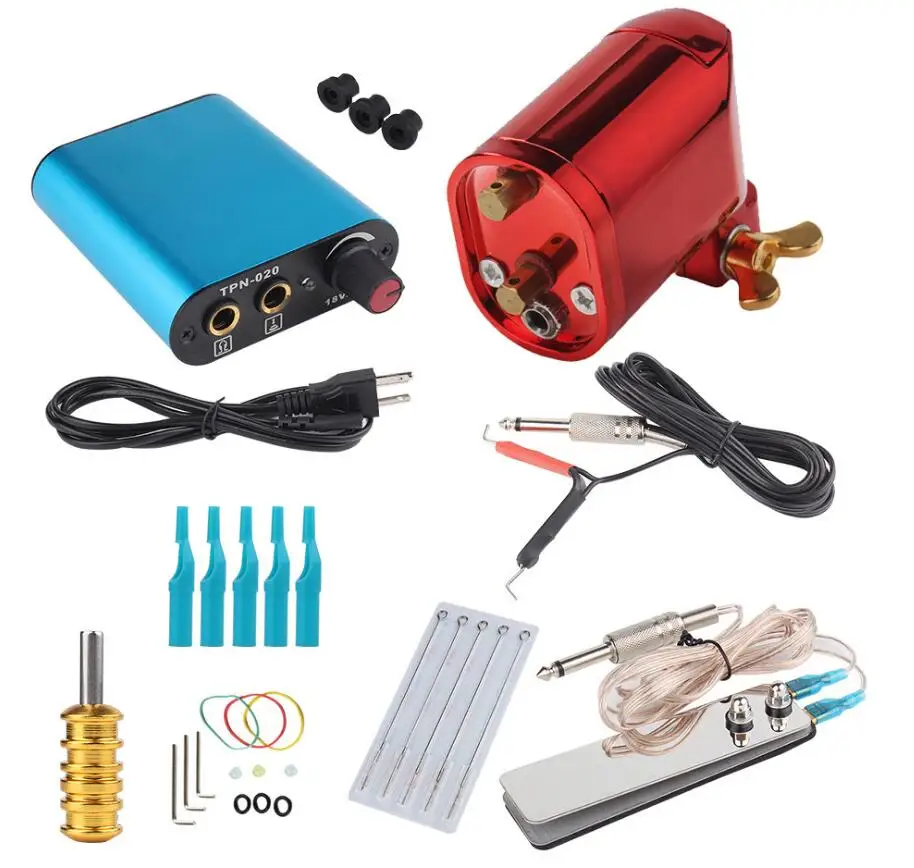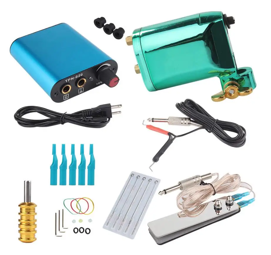 Новый beginer Описание продукта: 1 x новая лучшая тату-машинка для вращения. 1 х черный мини 110-220 В тату машина питания 1 ножная педаль 1 зажим шнура 5RL иглы 5x одноразовые наконечники 1 х сплав захват машины татуировки 3 x петлевые стропы 3 х резиновый станок уплотнительные кольца 3 x татуировки машины резинки 3 x инструменты регулировки