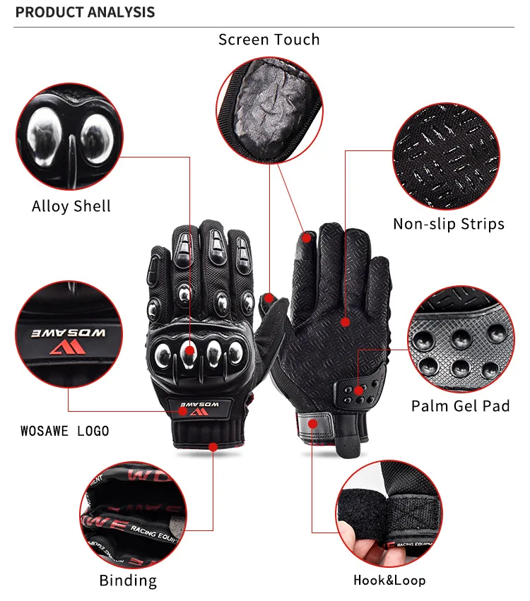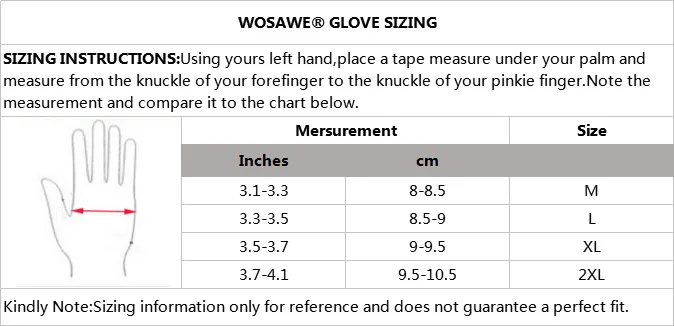 Характеристики продукта Описание s. Эти велосипедные перчатки имеют высокопрочную защитную нержавеющую сталь. Дизайн наклейки подходит для запястья, сохраняя тепло и ветронепроницаемость. Каждое соединение имеет защитный, non-slip, сенсорный экран дизайн. Отличное качество. Подходят для велоспорта, альпинизма, катания на лыжах и катания на коньках. Особенности [точный сенсорный экран] точный сенсорный экран для пальцев, очень удобно использовать мобильный телефон во время езды [защита из нержавеющей стали] использовать высокопрочную нержавеющую сталь на задней стороне ладони, держите палец вдали от травм [Нескользящая искусственная кожа] Полное покрытие нескользящей искусственной кожи внутри ладони [Регулируемая наклейка] есть Регулируемая наклейка на запястье, легко носить [Подушечка для суставов ладони] на области суставов ладони имеется прочная полиэтиленовая подкладка, которая эффективно предотвращает длительную езду, эффективно защищает ладонь, защита вашей ладони при падении [удлинение запястья] дизайн удлинения запястья, сохраняет тепло и ветронепроницаемость [Высококачественная нейлоновая ткань] изготовлена из специальной нейлоновой ткани для хорошего поглощения влаги и впитывания влаги [Губка EVA] в каждой части есть губка EVA, удобная обувь для верховой езды [отличный пошив] демонстрирует отличное качество и качество изготовления [WOSAWE leather label]WOSAWE leather label on back [4 размера на выбор] M,L,XL,XXL 4 размера на выбор, подходит для ваших рук, детали товара, мотоциклетные перчатки марки WOSAWE, модель BST-017, Пол мужчины и женщины, размер M,L,XL,2XL, цвет черный, красный, вес 250 г, материал нейлон, EVA губка, искусственная кожа, нержавеющая сталь Применение мотоцикл, Велоспорт, катание на лыжах, скейтборд пакет PE Сумка
