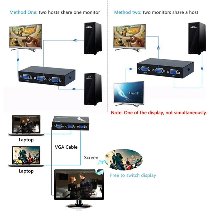 Примечание: этот коммутатор VGA не может одновременно отправлять 1 сигнал VGA на 2 монитора (не сплиттер).