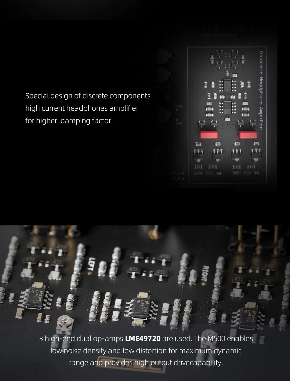Чип ES9038PRO D/A от ESS входит в комплект M500 вместе с высокопроизводительным чипом источника питания ES9311, который выводит чип D/A на пределы с низким уровнем шума (до 1 уврм). Он способен декодировать XMOS-XU208 MQA для передачи звука оригинальной основной записи, обработки истинного 32-битного звука, DoP и родного DSD и достижения 32-битного/768 кГц и DSD512. Три высококлассных двойных операционных усилителя LME49720 также входят в комплект M500. Наконец, в комплект входит также пульт дистанционного управления, поэтому вы можете легко менять входы/выходы и регулировать громкость.