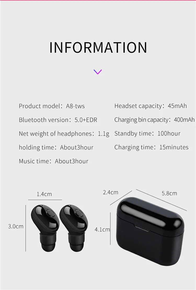 Название продукта A8 5,0 Bluetooth TWS Dual Ear Bluetooth Цвет: черный, белый Характеристики динамика 8 медное кольцо Динамик сопротивление: 16 Ом Частотная характеристика динамика 20 Гц ~ 20 кГц Номинальная мощность динамика 3 мВт Динамик 1k чувствительность 98дБ Время работы в режиме разговора (средний объем) 3 ч Время воспроизведения музыки (средняя громкость) 3 ч Время работы в режиме ожидания: 100h Чип Bluetooth JL6939 Версия Bluetooth 5,0 + edr Расстояние передачи (м) 7-10 м Потребляемая мощность 16-20 мА Вход мощность 93 МВт Время зарядки наушников 1 ч Емкость аккумулятора для наушников 50 мАч Емкость аккумулятора для зарядки 400 мАч Время зарядки 3 раза Время зарядки за пределами зарядного отсека 1 ч Батарея напряжение 3,2-4,2 v Содержание энергии литиевой батареи (Ватт часов) 0.203wh Спецификация упаковки 95*80*35 мм Вес одного продукта 38,6 г Вес машины 62 г Аксессуары Руководство + линия передачи данных + Ухо
