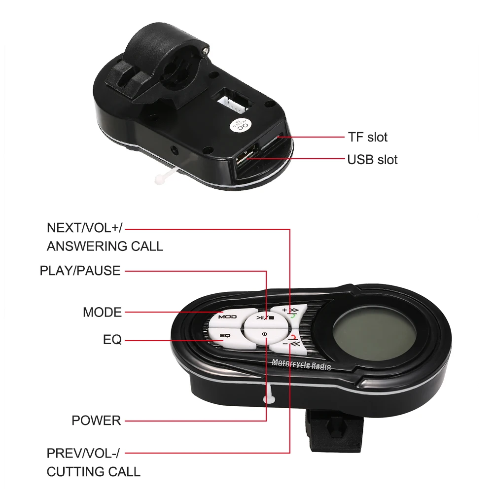 Особенности: 100% Бренд новый высокое качество. Функция радио, поддержка TF, MMC карты, U диск воспроизведения С функцией AUX, looping music, после объема порошка и тока Музыка функции памяти Цвет аудио мотоцикла: черный Поддержка функции FM/TF/USB, с BT, функция защиты от кражи, функция мобильного заряда,