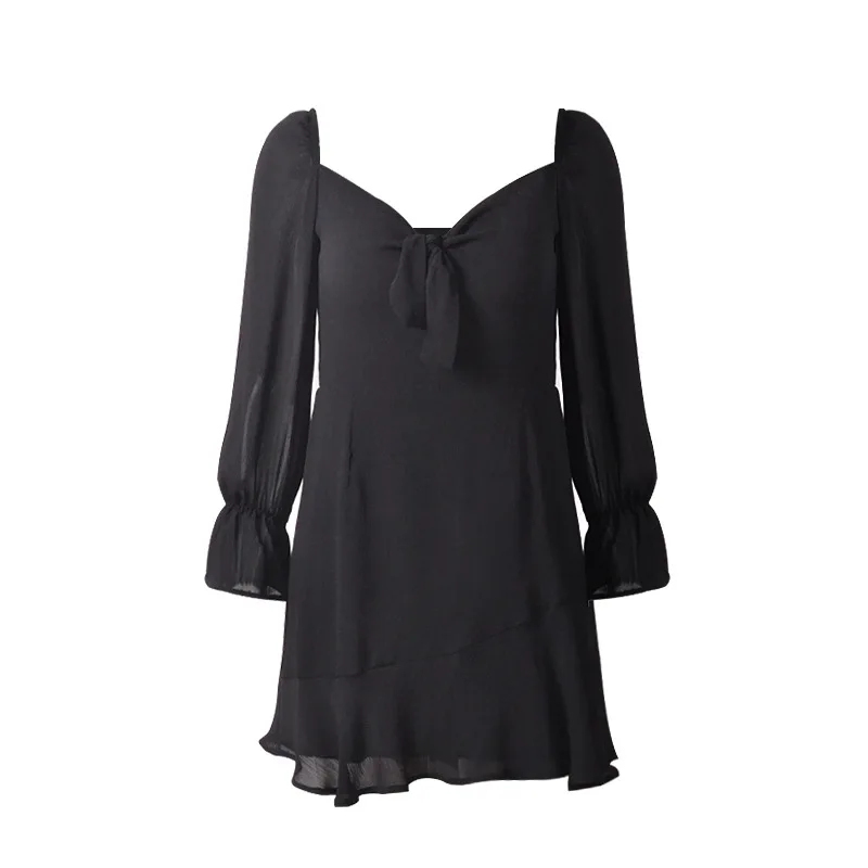 Женское платье, сексуальное, милое, с длинным Расклешенным рукавом, черное, шифоновое, летнее, офисное, Дамское, рабочая одежда, элегантное, Vestidos de Verano