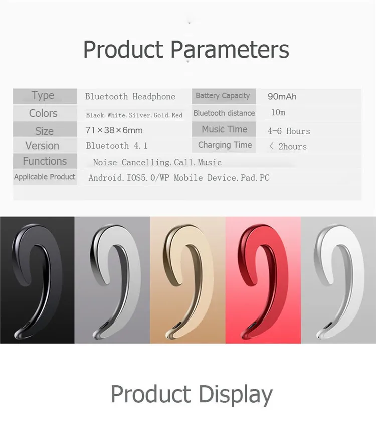 1) Драйвер: 8 мм 2) Сопротивление: 16 Ом 3) Версия Bluetooth: Bluetooth v4.1 + EDR 4) Bluetooth Используйте диапазон частот: 2,4 ГГц 5) уровень мощности: класс II 6) Выходная мощность: 30 мВт 7) Расстояние Bluetooth: 10 метров без шлагбаума 8) Частотная характеристика: 20-20000 Гц 9) Диапазон рабочего напряжения: 3,0 V-4,2 V 10) Чувствительность микрофона: -42 дБ 11) A2DP / AVRCP высокое качество стерео аудио передача и протокол дистанционного управления 12) Мощная Схема шумоподавления (активное шумоподавление) Особенности: 1) прослушивание песен и звонков, поддержка прослушивания песен и звонков, 2) мобильный телефон IOS имеет дисплей питания, вы можете смотреть мощность гарнитуры в любое время, не беспокойтесь о недостаточной мощности в гарнитуре, позвольте вам жить без беспокойства; 3) один для двух подключений, два мобильных телефона могут быть подключены одновременно; 4) каждый раз, когда bluetooth-гарнитура подключается к телефону, bluetooth-гарнитура автоматически подключается к телефону при включении, что удобно и быстрее; 5) Интеллектуальная Совместимость: Поддержка всех мобильных телефонов с функцией Bluetooth, планшетом, ноутбуком, поем, музыкой Q, фильмами и т. д. Емкость аккумулятора: 75 мА/с защитной панелью Время работы: около 5-6 часов Время работы в режиме ожидания: около 160 часов Вес нетто: 8 грамм Вес брутто: 33 грамма Размер упаковки: 14*10*2 Функция: дисплей батареи, ответ на вызов, воспроизведение последнего номера, переключение песни, пауза воспроизведения, регулировка громкости