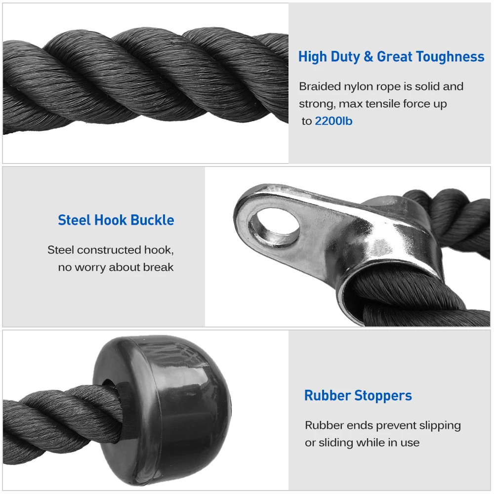 Сверхпрочный черный нейлоновый плетеный трос, сила растяжения до 2200 фунтов, с прочными резиновыми стопперами предотвращают скольжение или скольжение во время занятий. Потрясающая система шкива для тренировки большой группы мышц и увеличения силы сцепления.